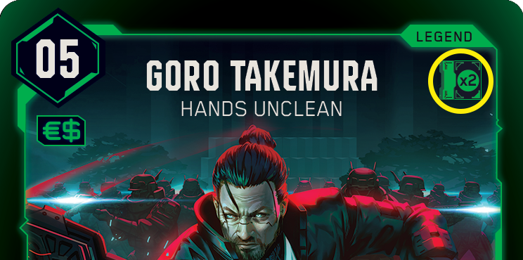 Jede Legend-Karte hat einen farbigen Rahmen und einen RAM-Wert oben rechts. Beispiel: Goro Takemura: Hands Unclean hat 2 grünes RAM. Das bedeutet: Ihr könnt grüne Karten mit einem RAM-Wert von maximal 2 in euer Deck packen.